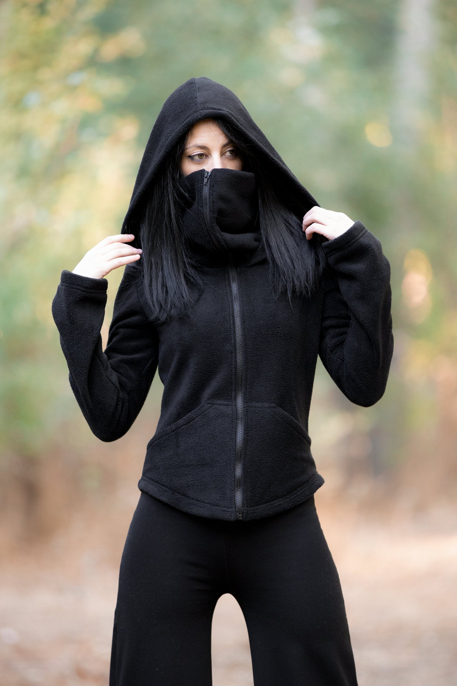 Black Ninja Hooded Fleece Jacket – Gothic Pixie Winter Coat with Face Mask