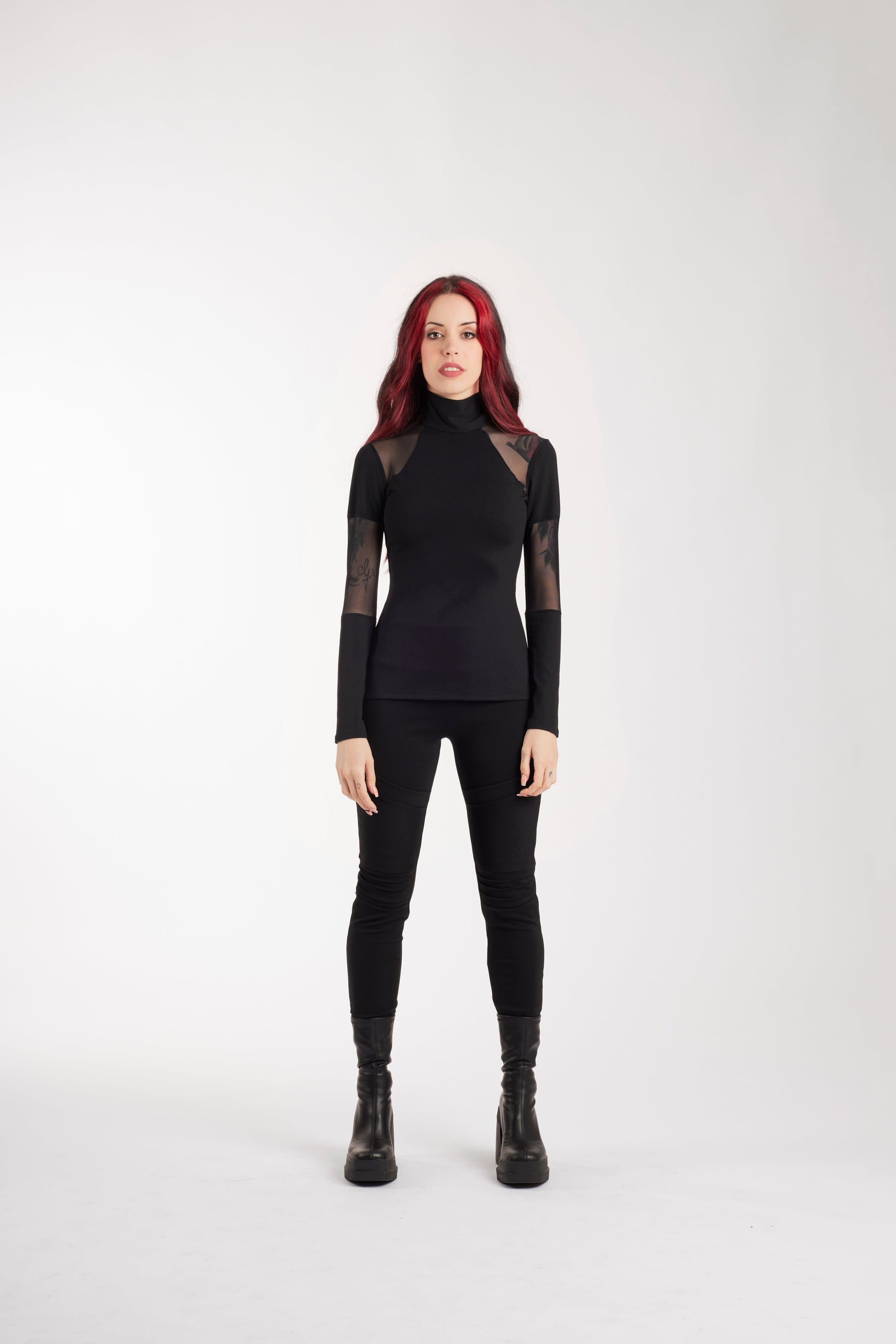 Tags: futuristic mesh top, gothic cocktail wear, high neck black shirt, ponte jersey long sleeve top, alt fashion blouse, made in Spain