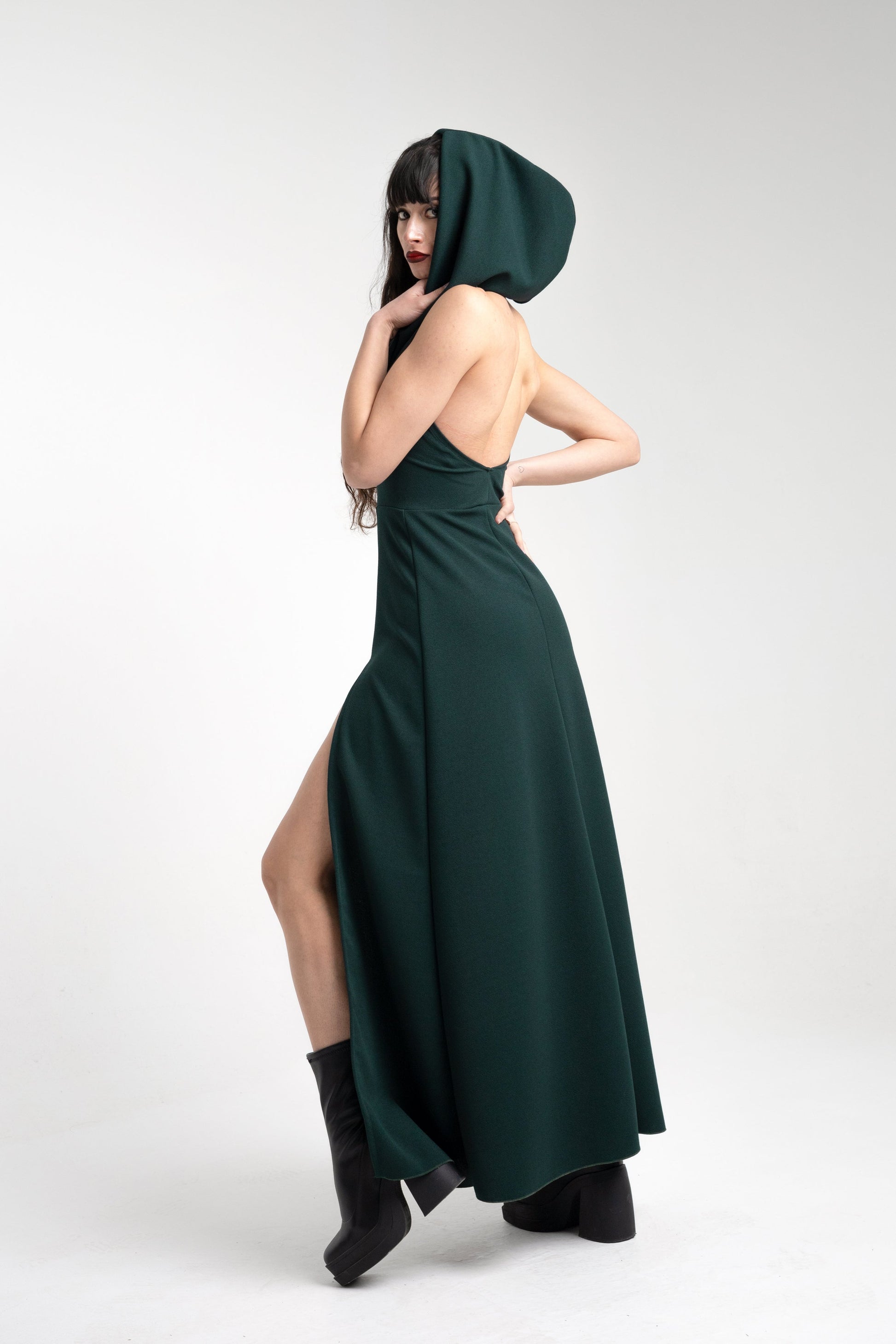 Long Hooded Gothic Dress with Open Back and Slits – Eco Scuba Crepe