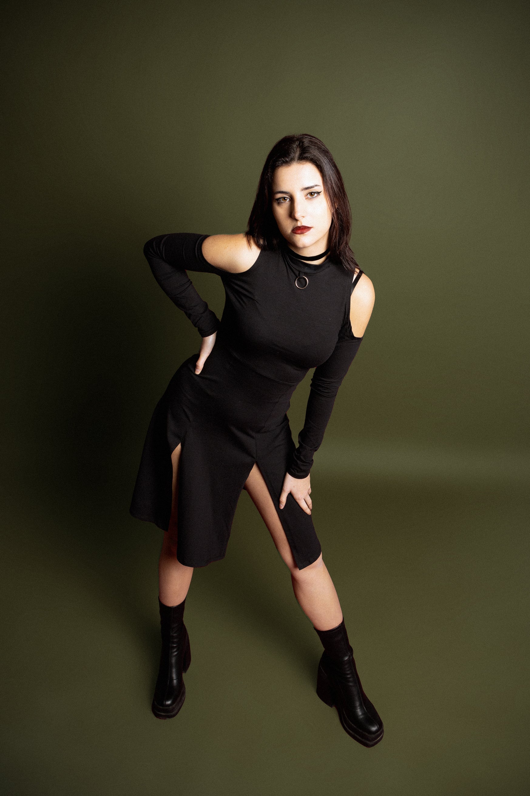 Tags: grunge midi dress, gothic black dress, cold shoulder outfit, front slits dress, organic cotton grunge clothing, long sleeve alt fashion, festival-ready gothic look, made in Spain