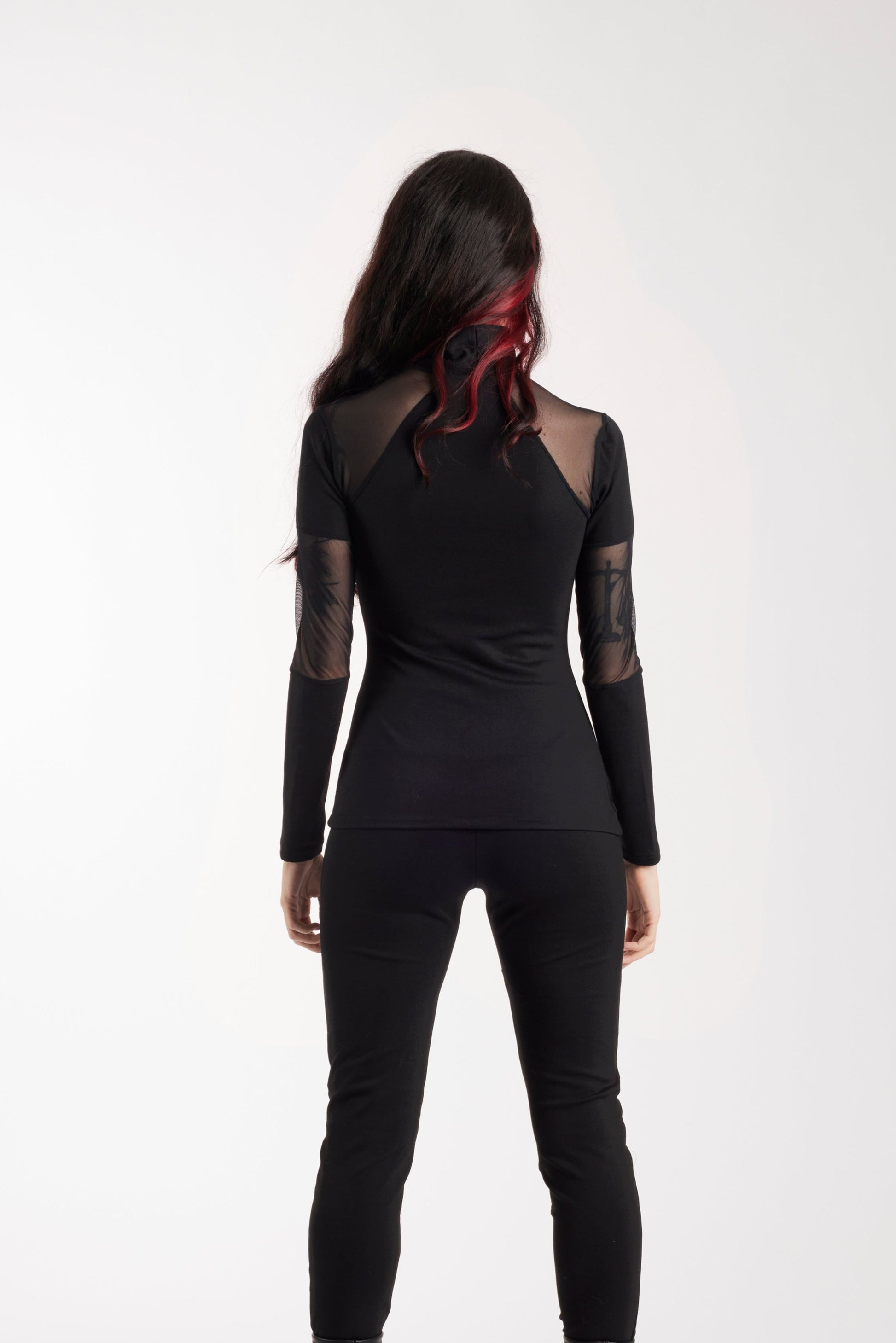 Tags: futuristic mesh top, gothic cocktail wear, high neck black shirt, ponte jersey long sleeve top, alt fashion blouse, made in Spain
