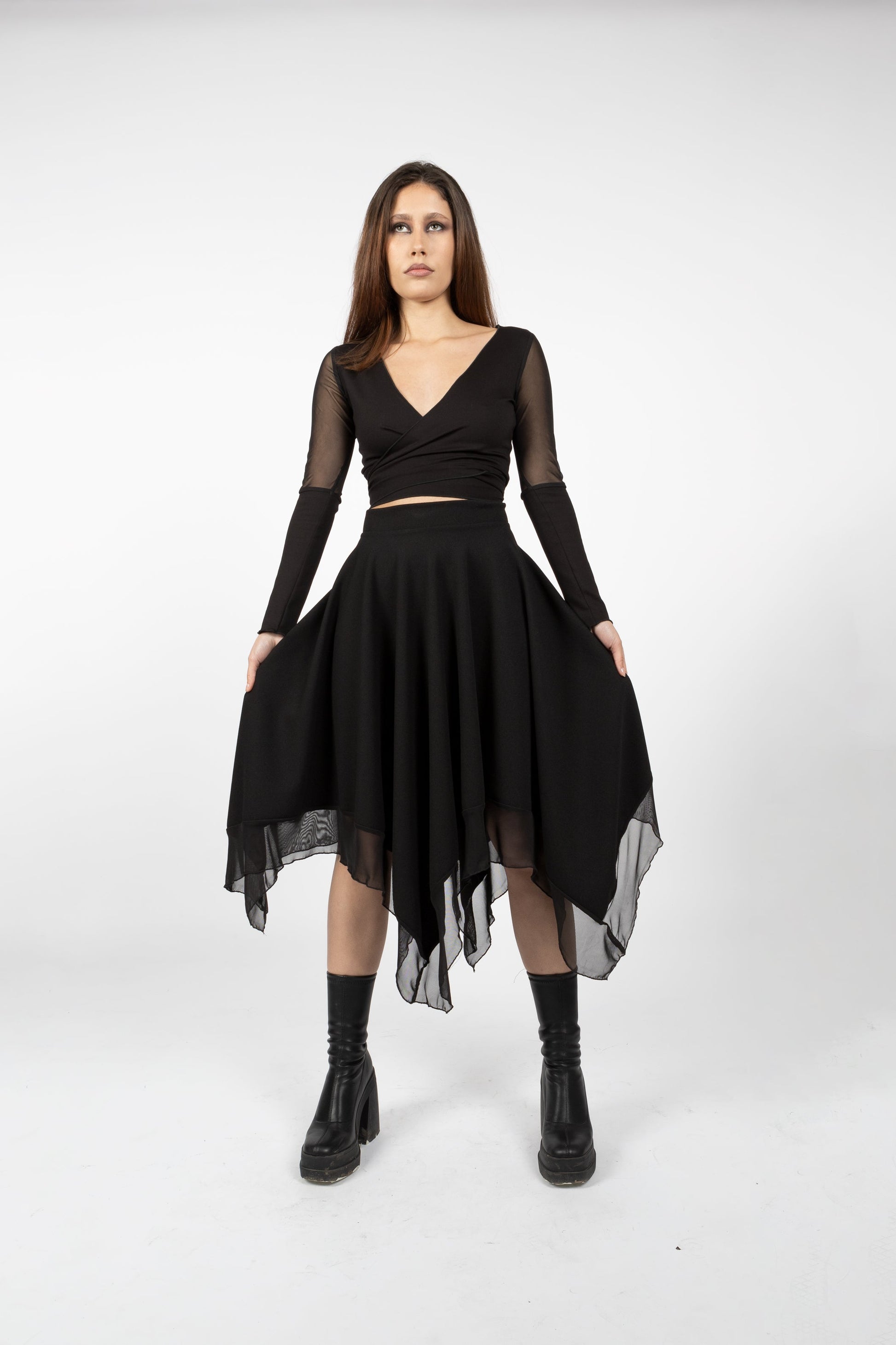 - Asymmetrical maxi skirt with flowing tulle finishes