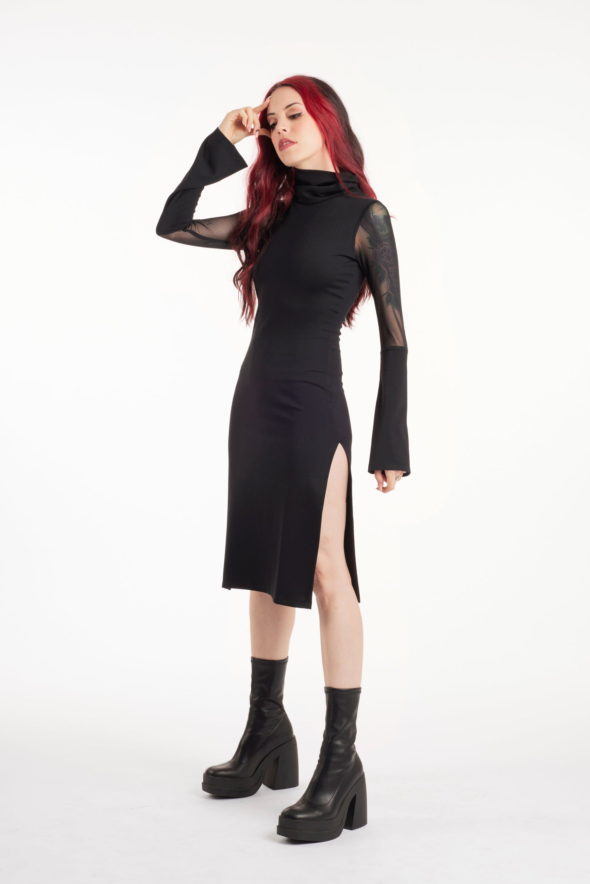 Tags: punk midi dress, grunge style dress, mesh sleeve dress, turtle neck alternative clothing, A-line punk outfit
