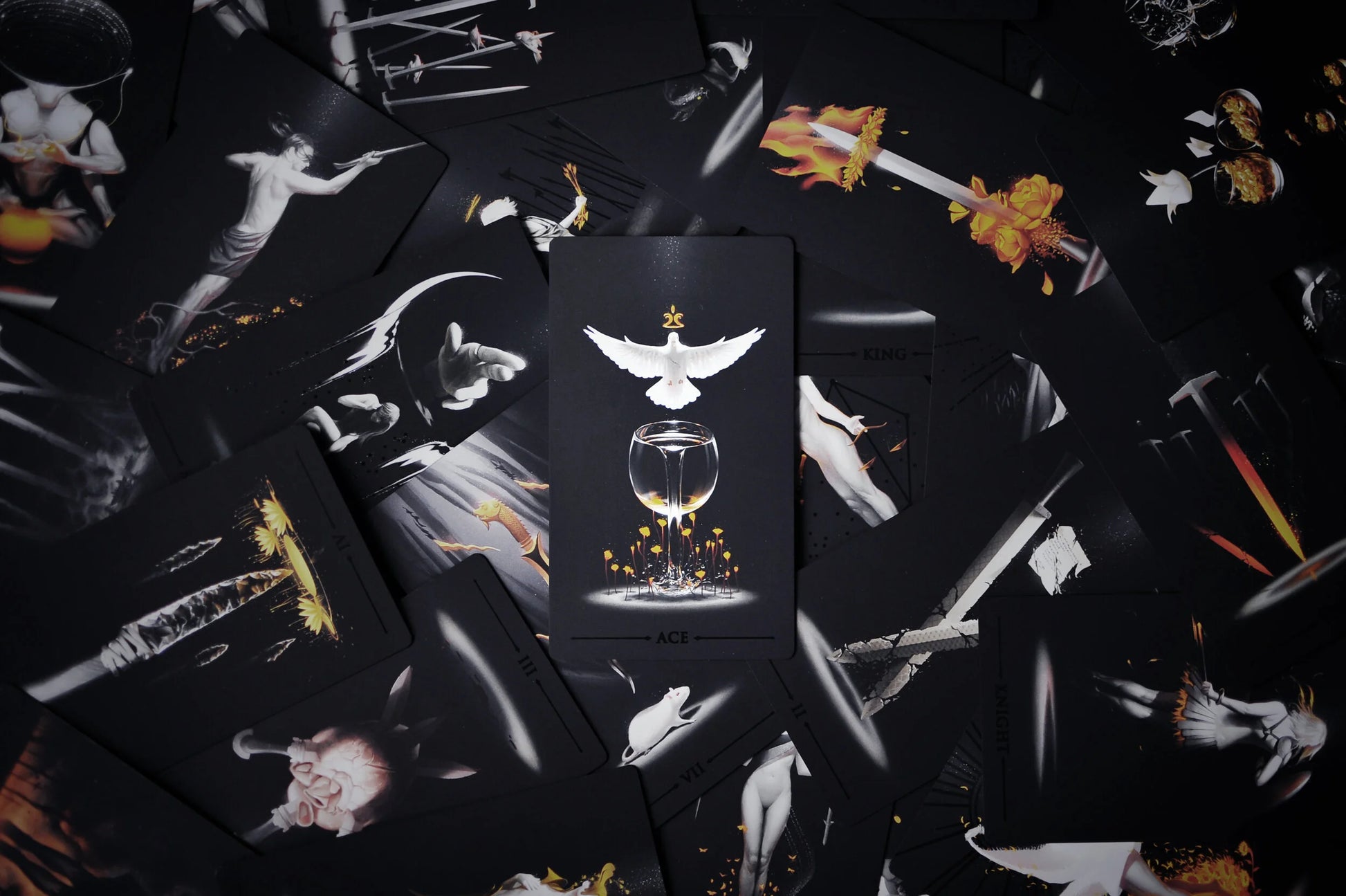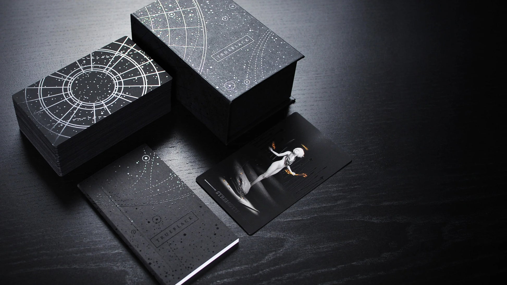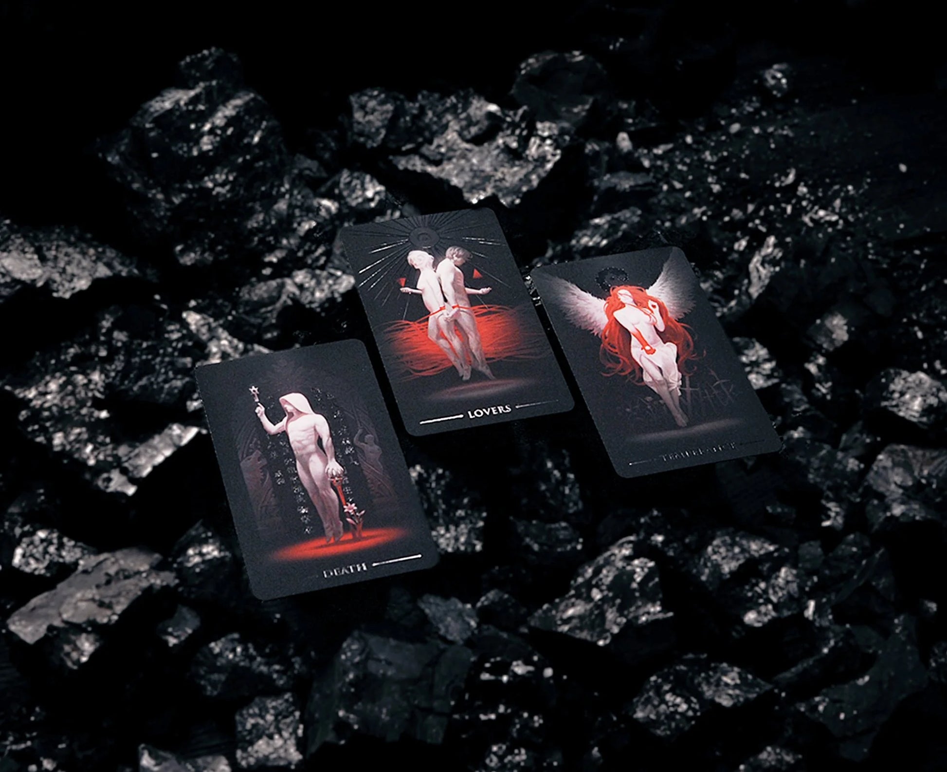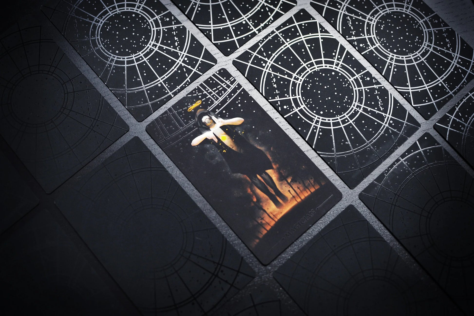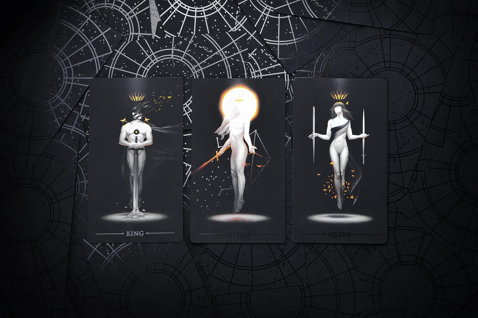 La cubierta de tarot más lujosa y de la más alta calidad del mercado, con tintas de Japón, recubrimientos de España, lámina de Alemania, cortada con cuchillas de tungsteno de Suiza e impresas en papel artesanal aquí en los Estados Unidos. Inigualable en calidad y artesanía.
